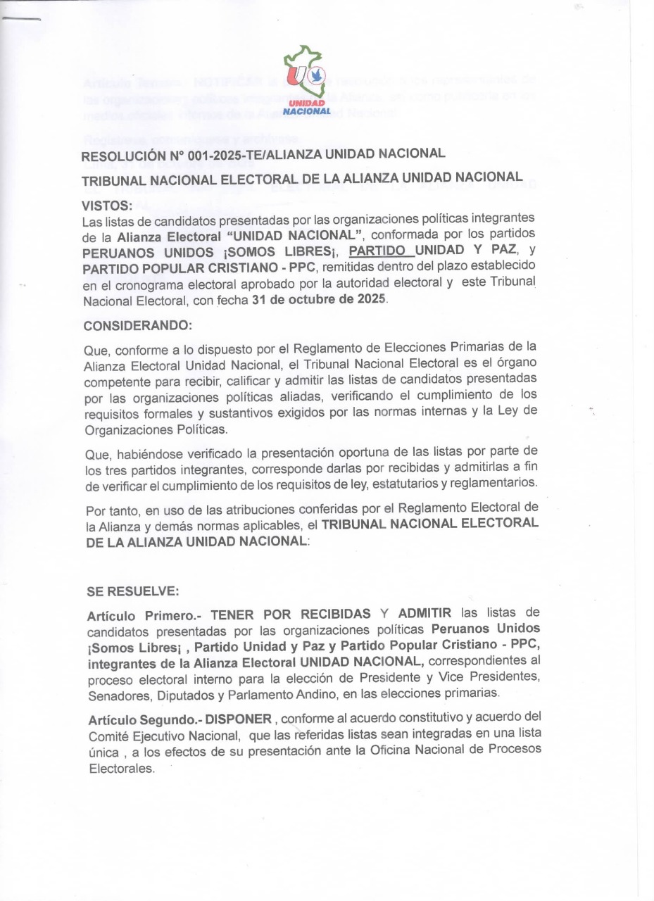 Resolución N°01-2025-TE/ALIANZAUNIDADNACIONAL